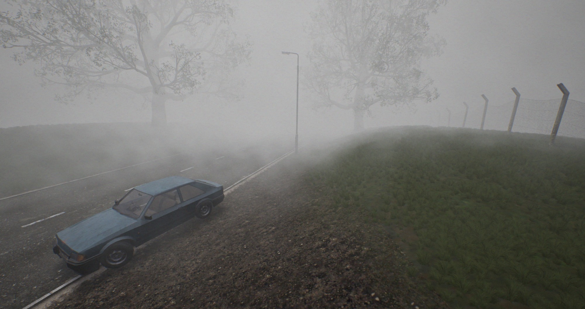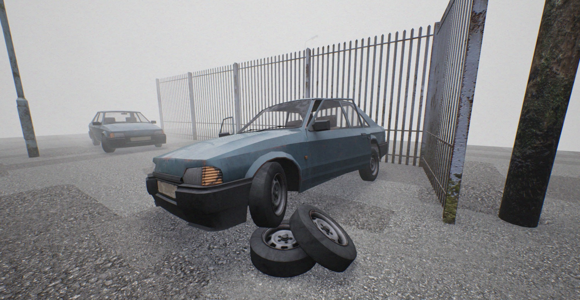 I went through a lot of trial an error trying to figure out how to make the components of the car interactive when in game. I ended up exporting separate meshes of the doors / body / wheels into Unreal, then using a blueprint to unite the all. The blueprint allows me to use the car model as a static prop. I can set the doors to be left open or shut, turn the front wheels and I went the extra mile and programmed a line trace that, once you've positioned the car body, will find the ground and position the wheels accordingly. This helps give the impression that the car is sitting on its suspension in an irregular way.