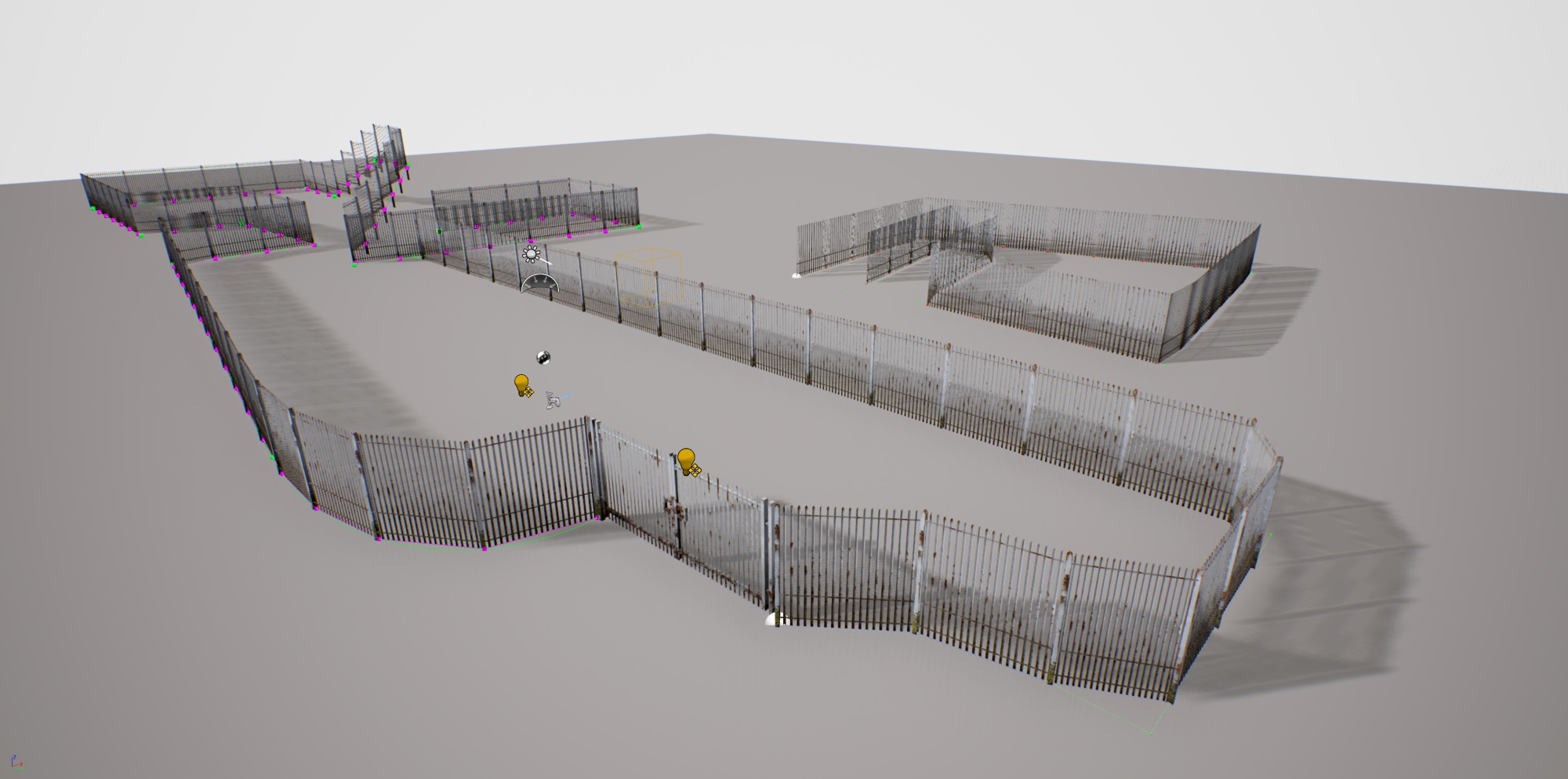 Another tool to ease modular construction and avoid hand placing repetitive parts. The blueprint evenly spaces out meshes along a spine, making sure to only contract to fill space and not stretch. This version is using the same skirting mesh for all three strips, but different meshes and materials for each be selected. Corner pieces are added where the spline encounters an outwards facing corner. Lightmaps are kept at a regular size and density.